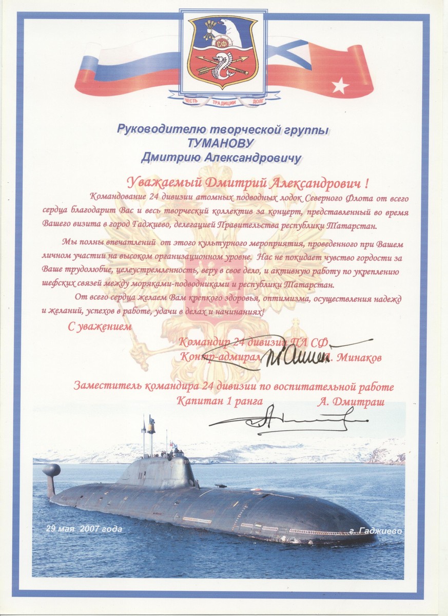 от котнр-адмирала А.Минакова, командира 24 девизии ПЛ СФ и капитана 1 ранга А. Дмитраша, заместителя командира 24 девизии по воспитательной работе