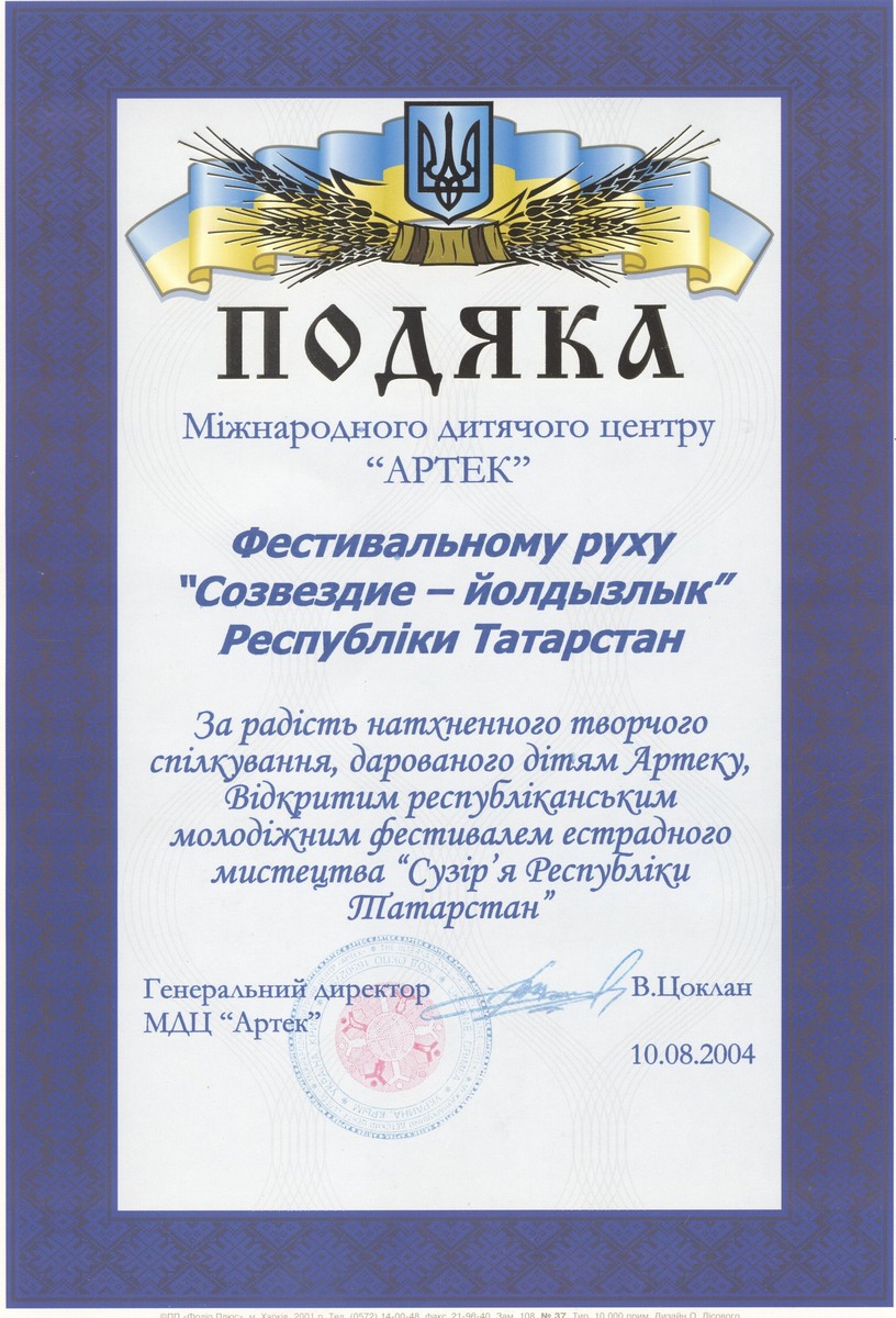 Благодарственное письмо от международного детского центра "Артек", Крым, Украина