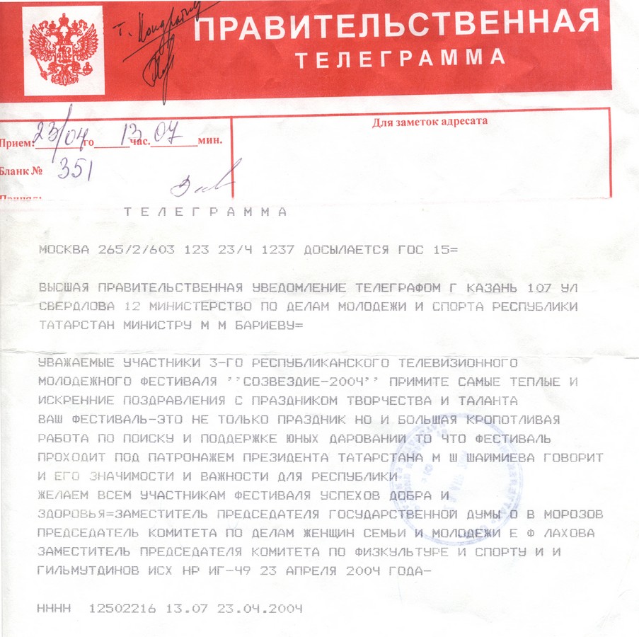 Приветственная правительственная телеграмма (2004)