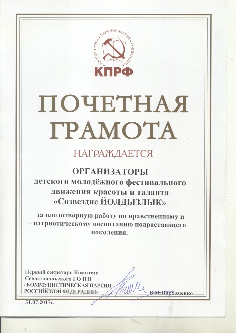 Почетная грамота от Первого секретаря Севастопольского ГК КПРФ В.М.Пархоменко
